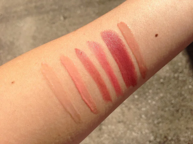 Bite Beauty, L-R (outside afternoon light): Lip Shine in Prosecco, Lip Shine in Sante, Luminous Creme Lipstick in Pepper, Luminous Creme Lipstick in Fig, Luminous Creme Lipstick in Shiraz, Honey Lip Laquer in Dolcetto